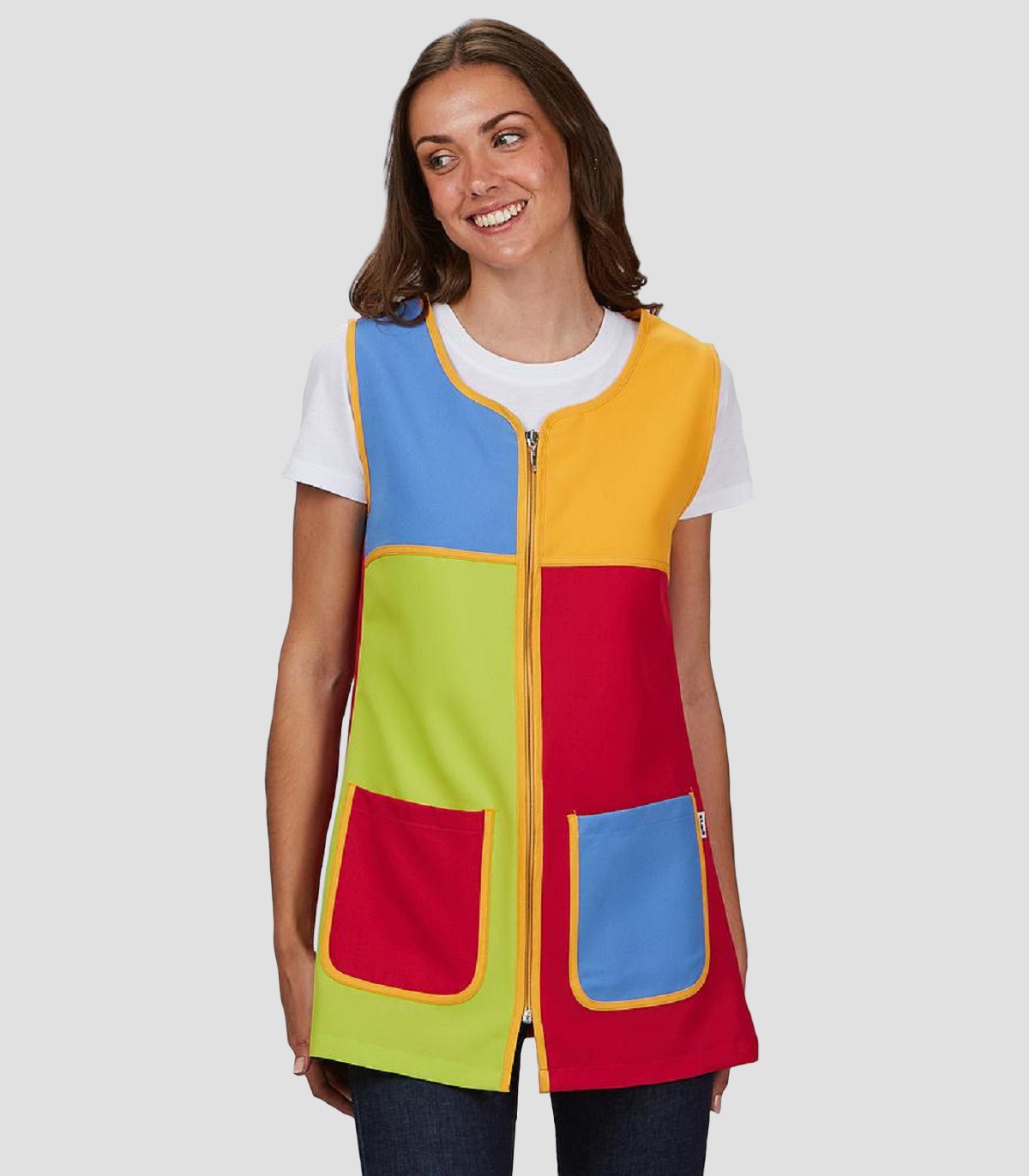 • Dos bolsillos delanteros prácticos, cada uno con bies de color combinado: uno en fucsia y otro en celeste.