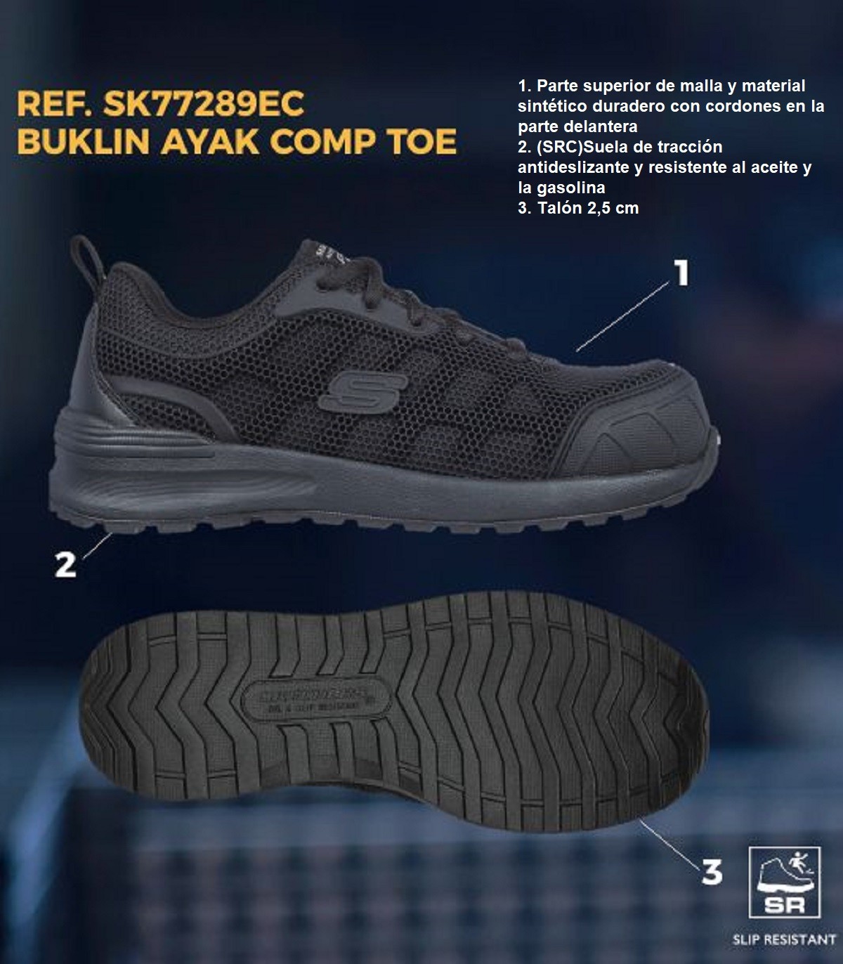 • Zapato de seguridad con parte superior de tejido sintético y malla suave y duradero, punta de seguridad, antideslizante, con detalles de costuras y plantilla Memory Foam.