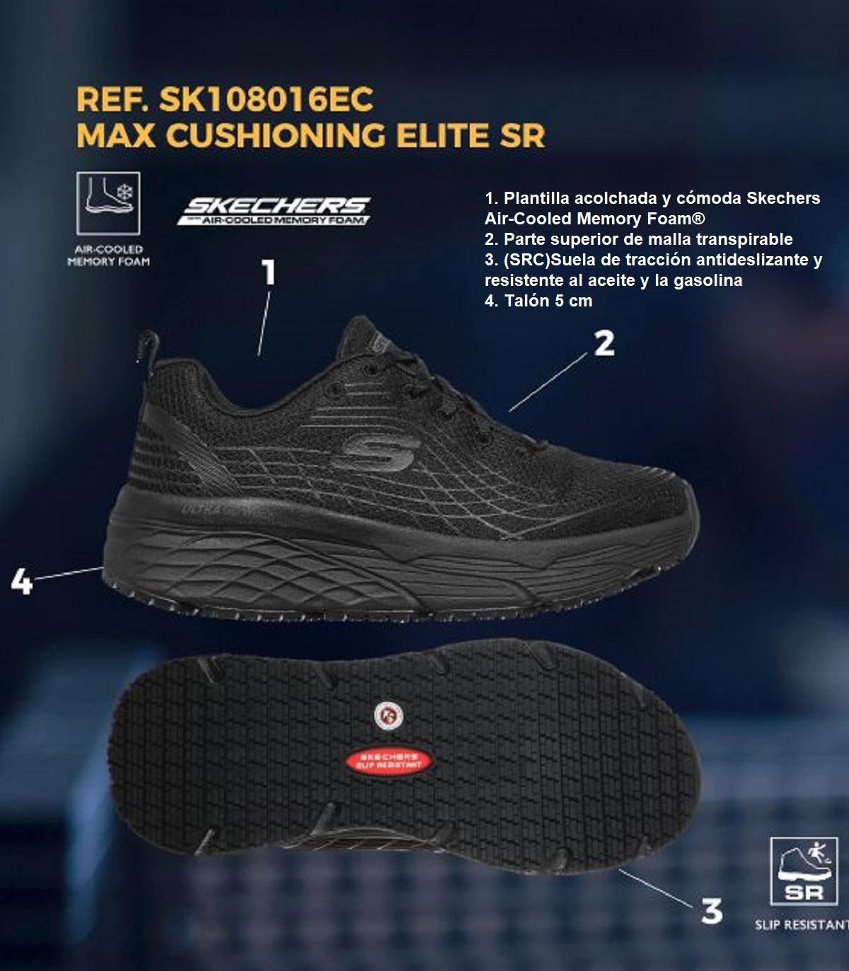 • Suela antideslizante nivel SCR testada en baldosa y acero. Resistente a hidrocarburos.