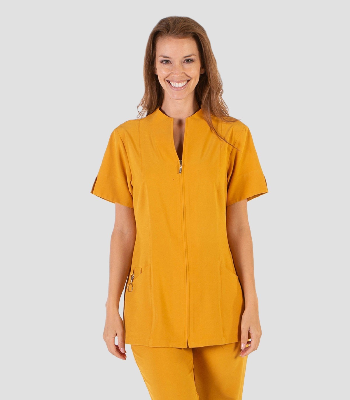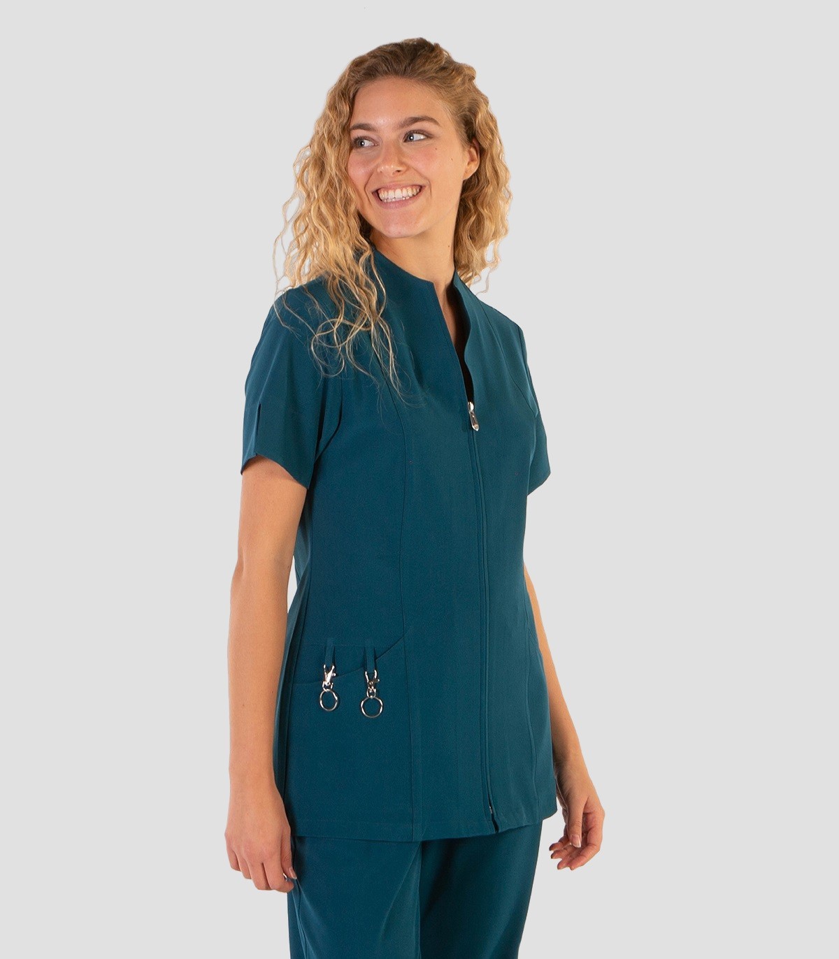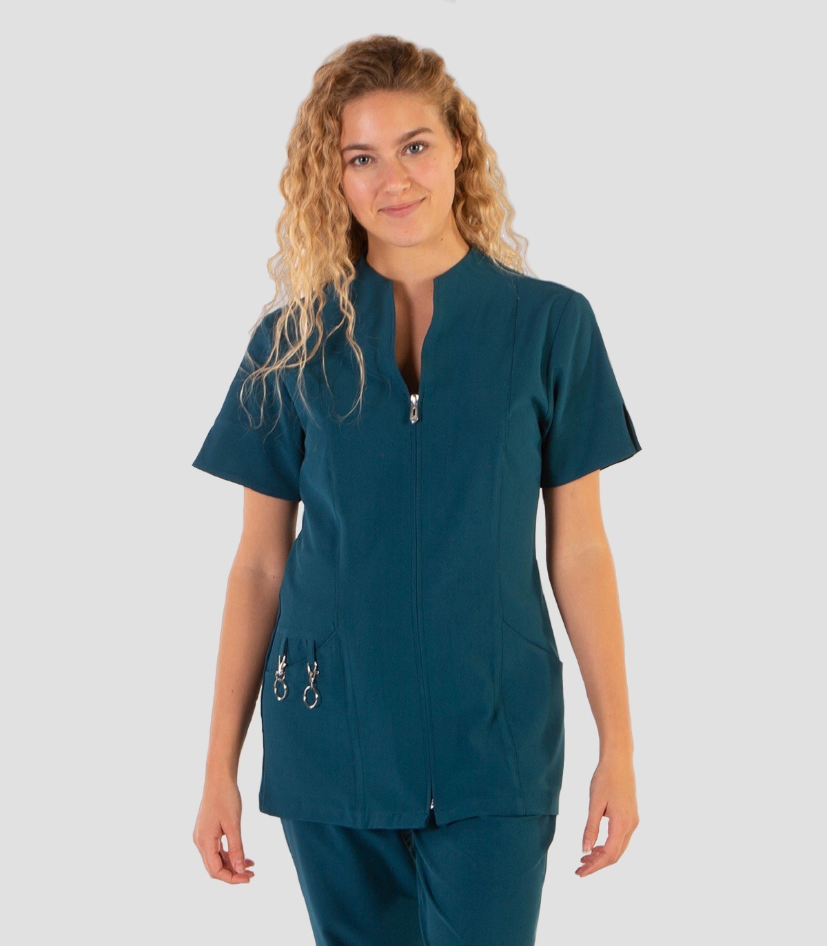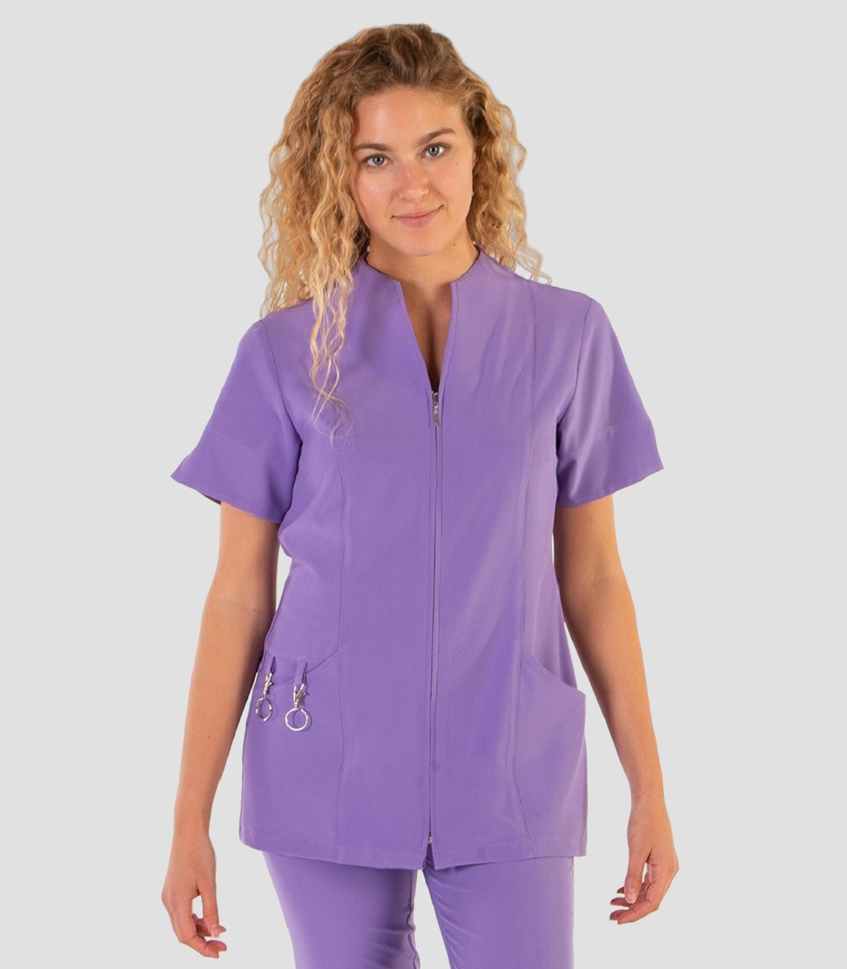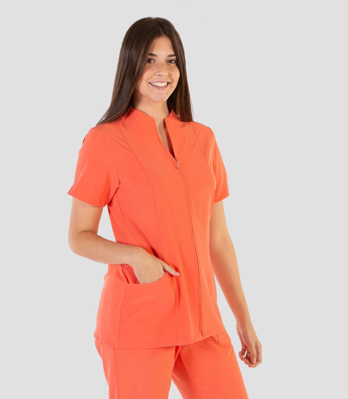 • Casaca sanitaria de mujer con cuello chimenea y cierre frontal mediante cremallera.