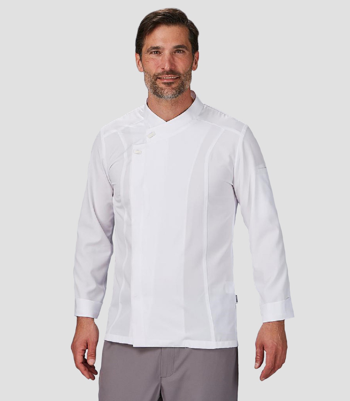 • La chaqueta de cocina hombre Díaz Súper Slim Fit es perfecta para aquellos que desean una prenda profesional con un corte moderno que realza la figura, sin sacrificar funcionalidad ni confort.