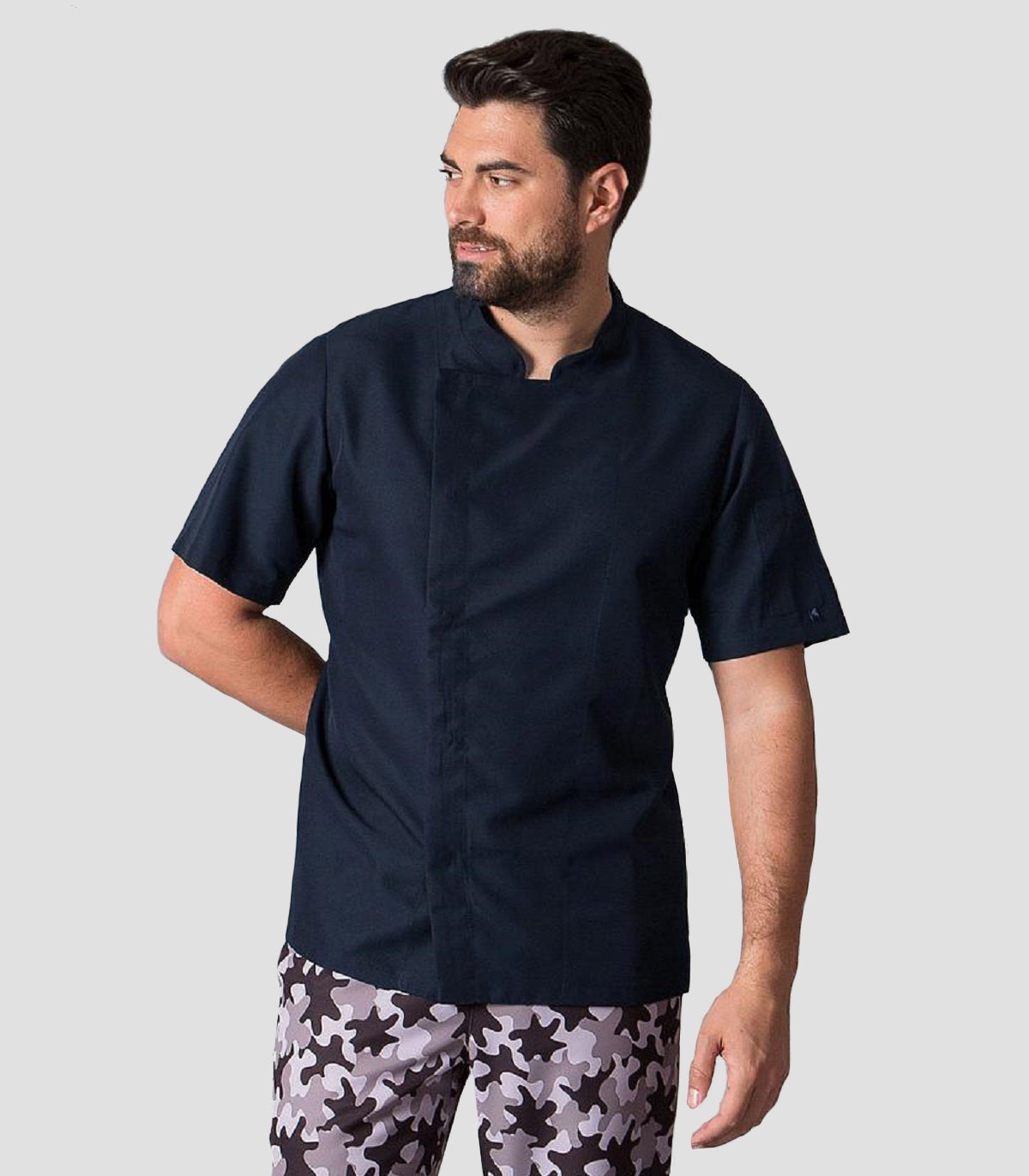 • Chaqueta cocinero con manga corta y cuello mao que ofrece un toque moderno y fresco.