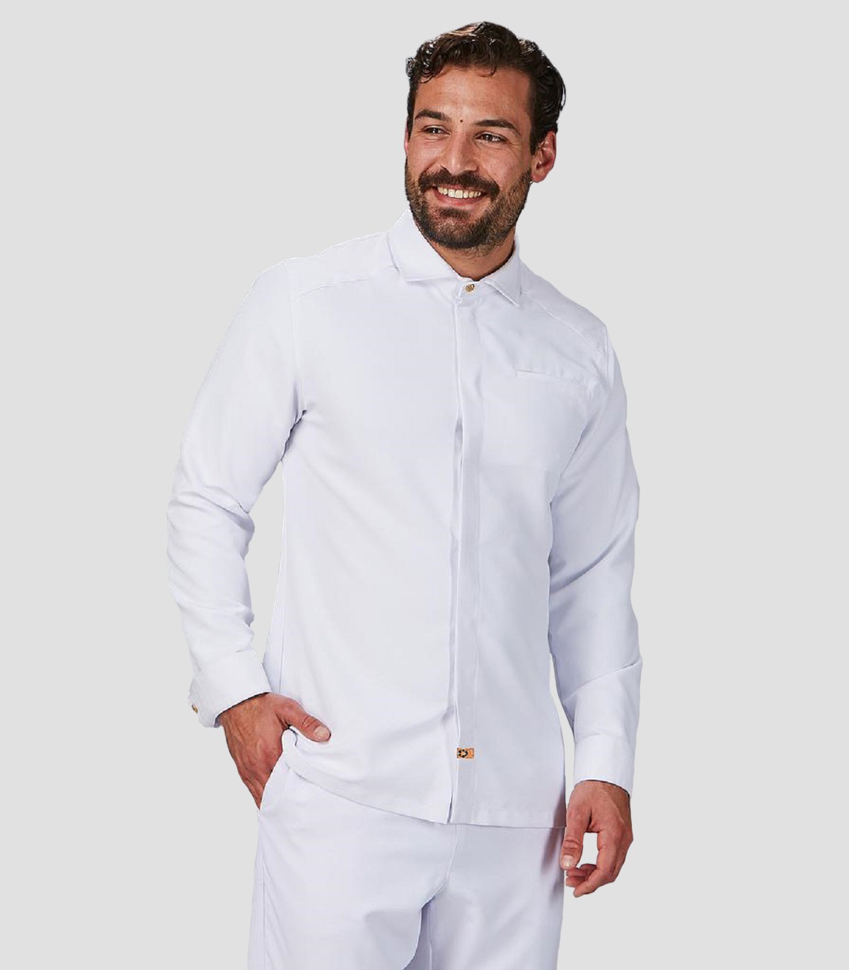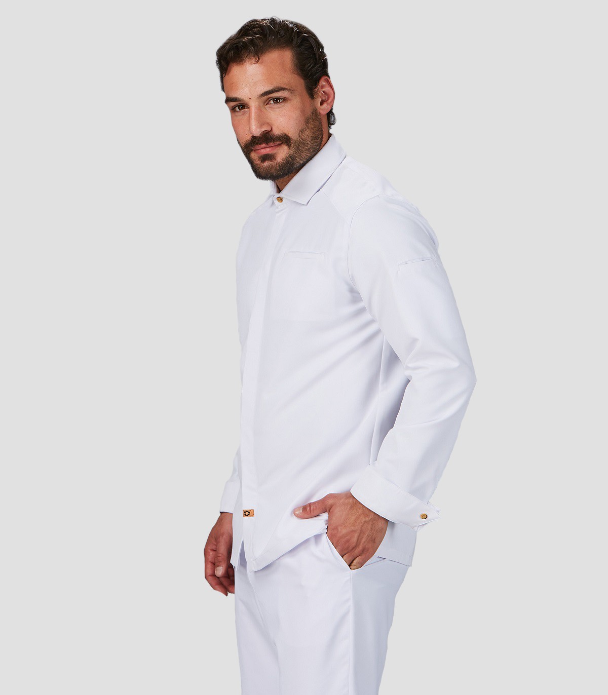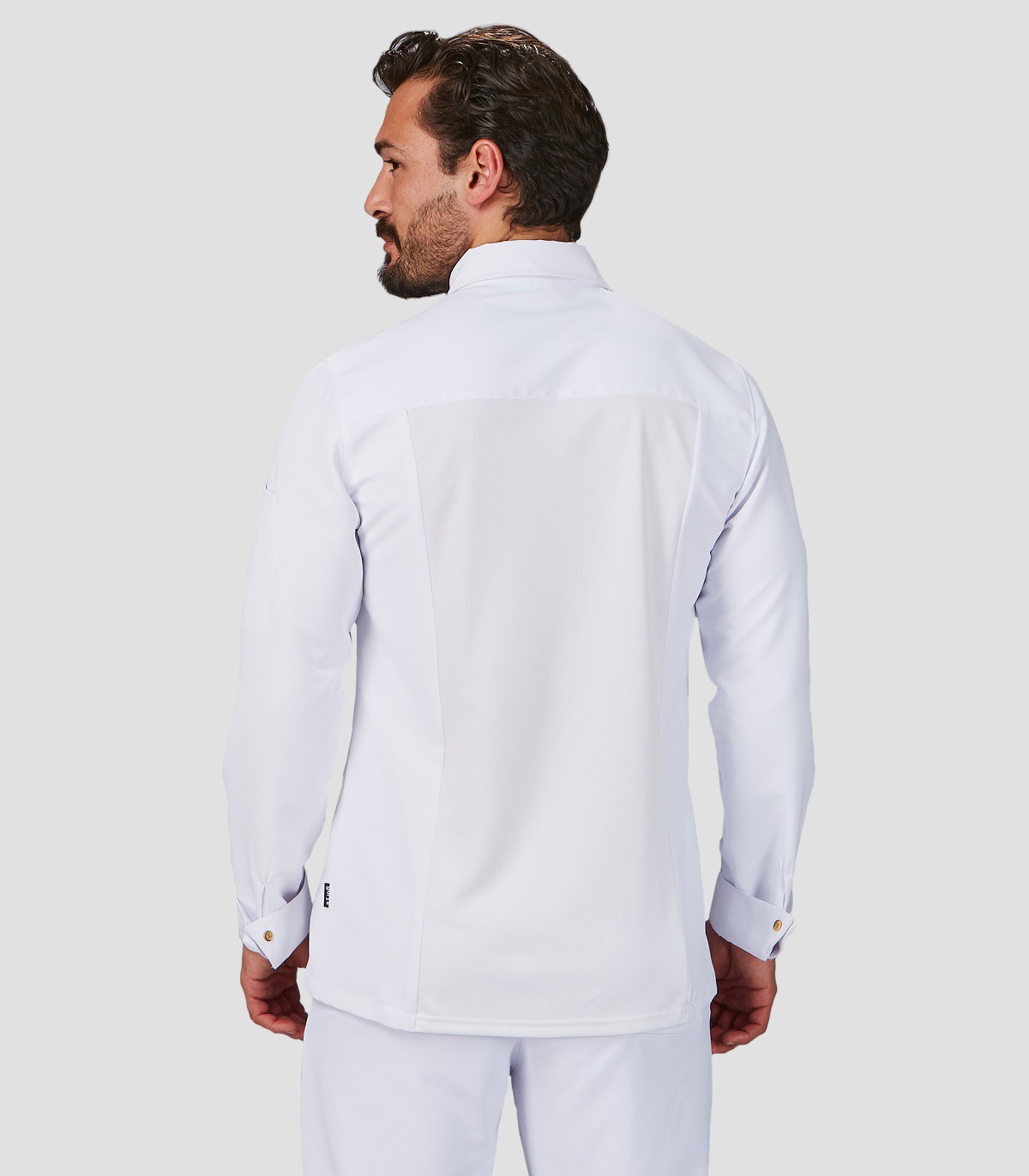 • Chaqueta de cocina con cuello italiano diseñada para profesionales que buscan una imagen impecable sin renunciar a la comodidad.