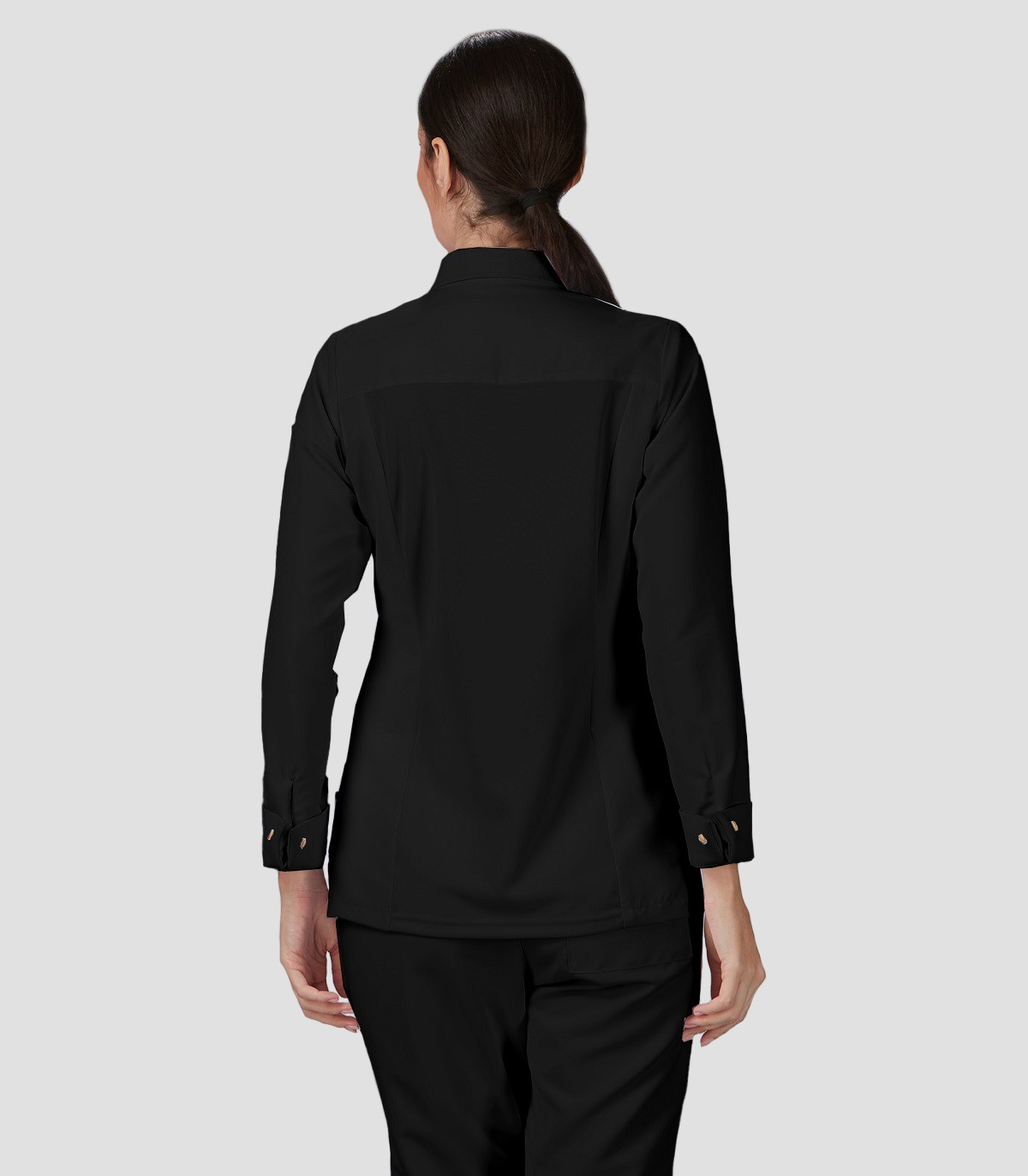• Puños vueltos y costuras estructuradas que realzan la silueta.