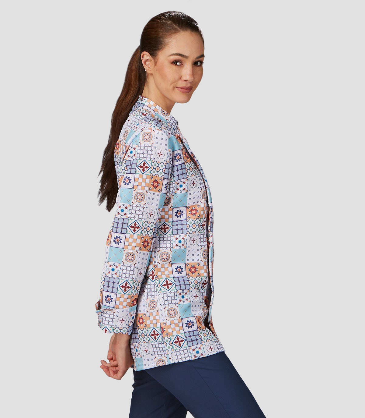• Cierre con botones de presión ocultos y los puños vueltos con presillas refuerzan su estilo limpio y funcional.