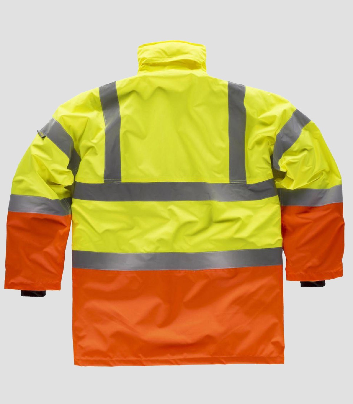 • Parka acolchada e impermeable en tejido Oxford, combinada y con cintas reflectantes. Parte superior de alta visibilidad.