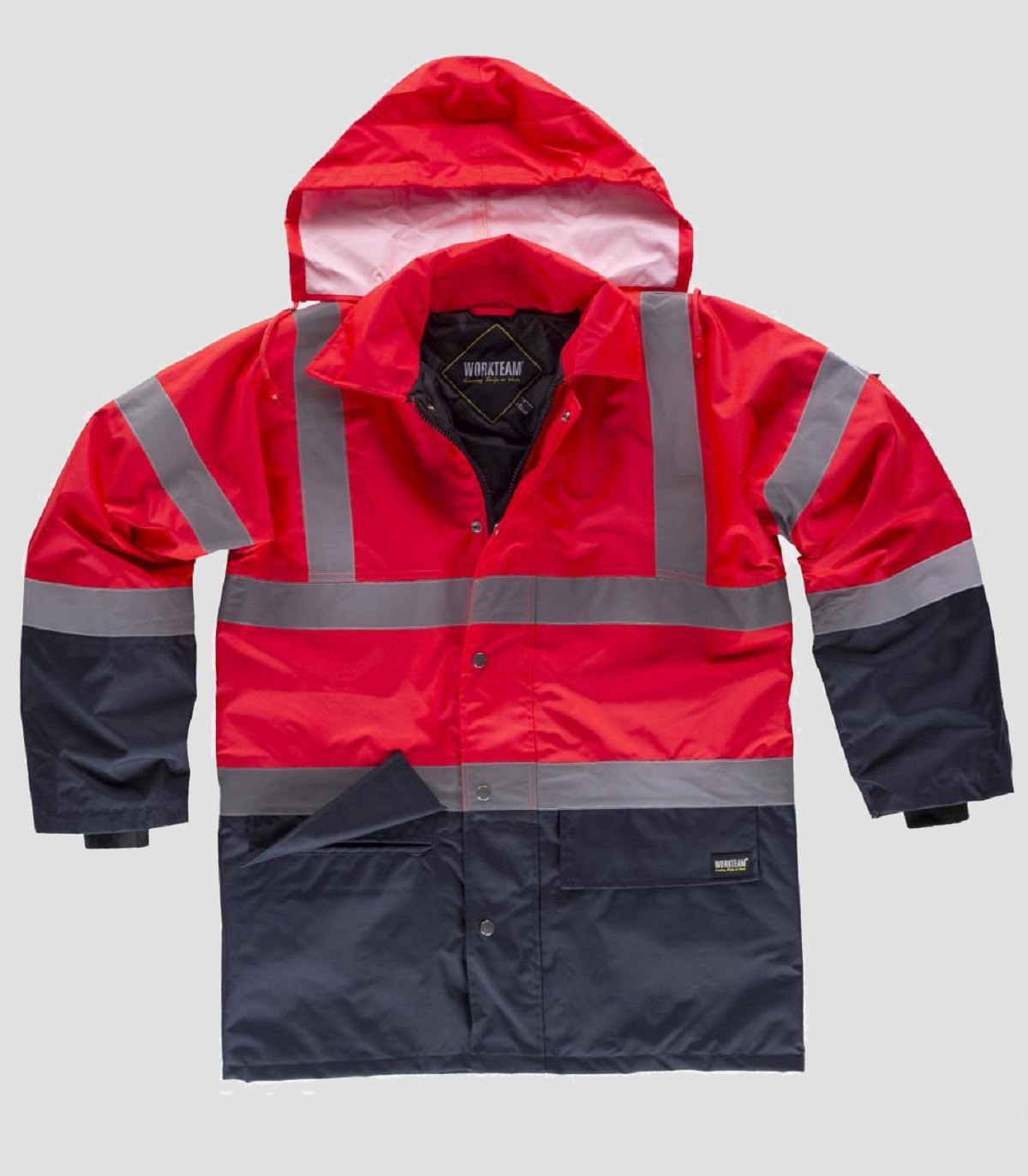 • Parka acolchada e impermeable en tejido Oxford, combinada y con cintas reflectantes. Parte superior de alta visibilidad.