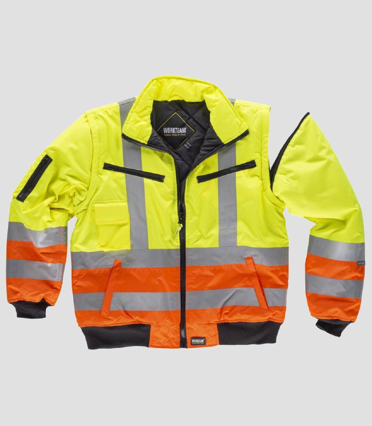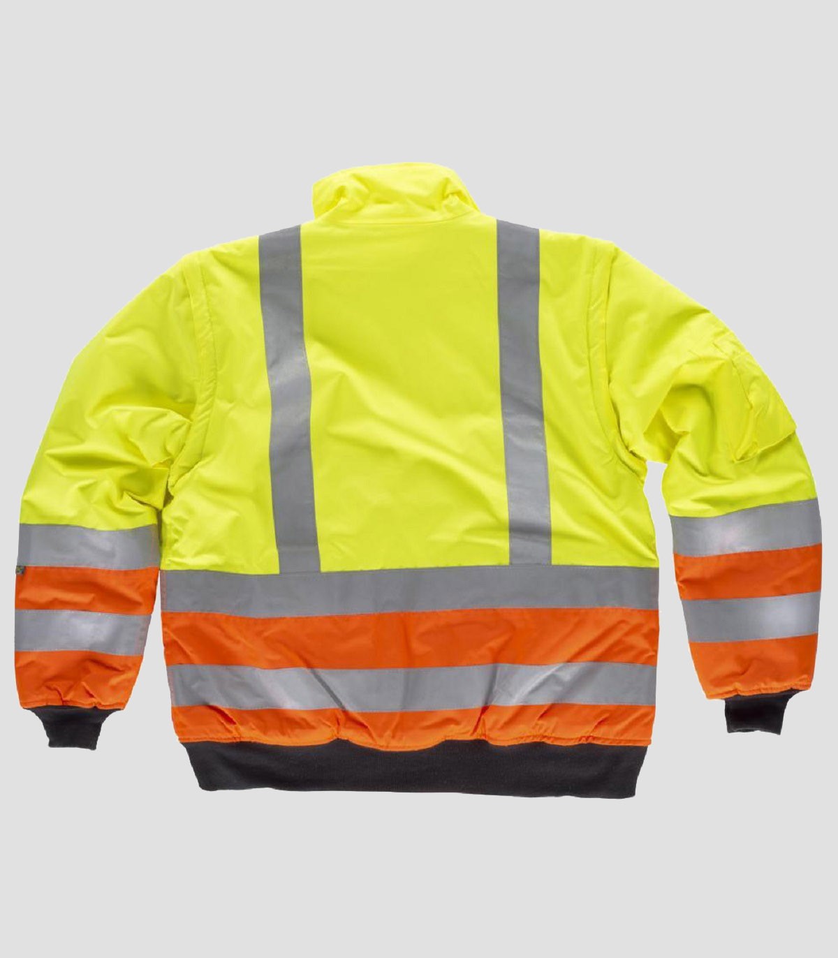 • Piloto acolchada e impermeable en tejido Oxford, combinada, con mangas desmontables y cintas reflectantes. Parte superior de alta visibilidad.