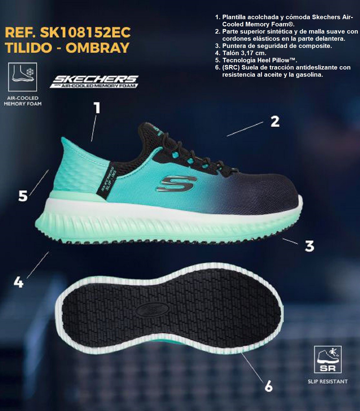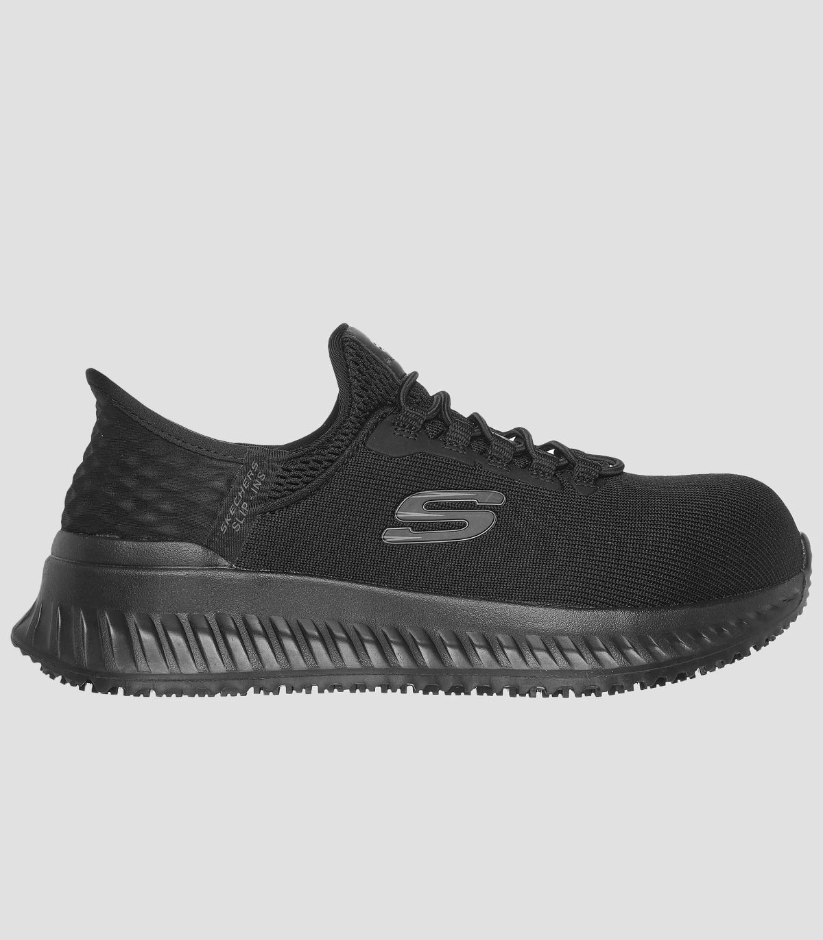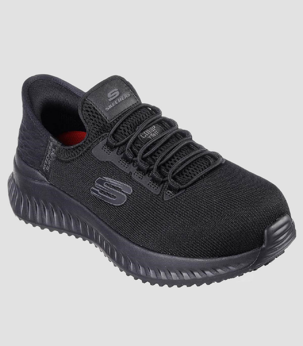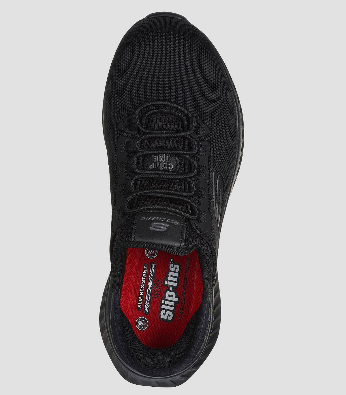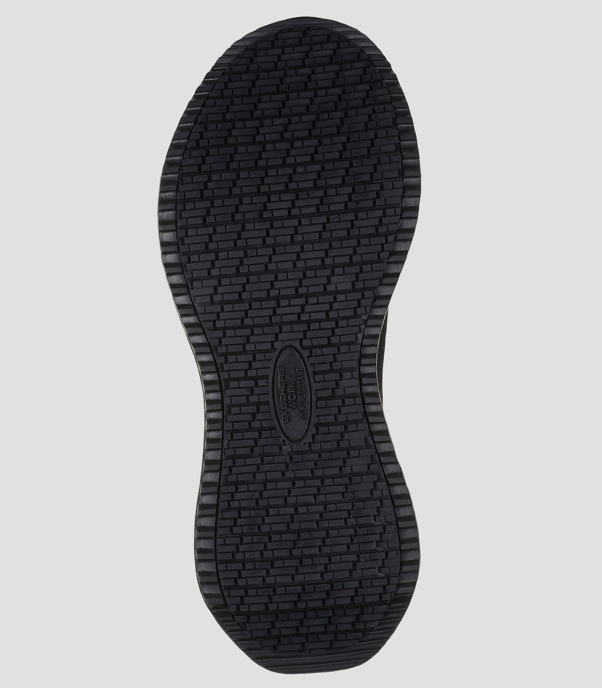 • Calzado Slip-on de trabajo cuenta con malla y parte superior sintética con un cordón elástico, panel de talón moldeado Skechers Slip-Ins® y plantilla acolchada Skechers Air-Cooled Memory Foam®.