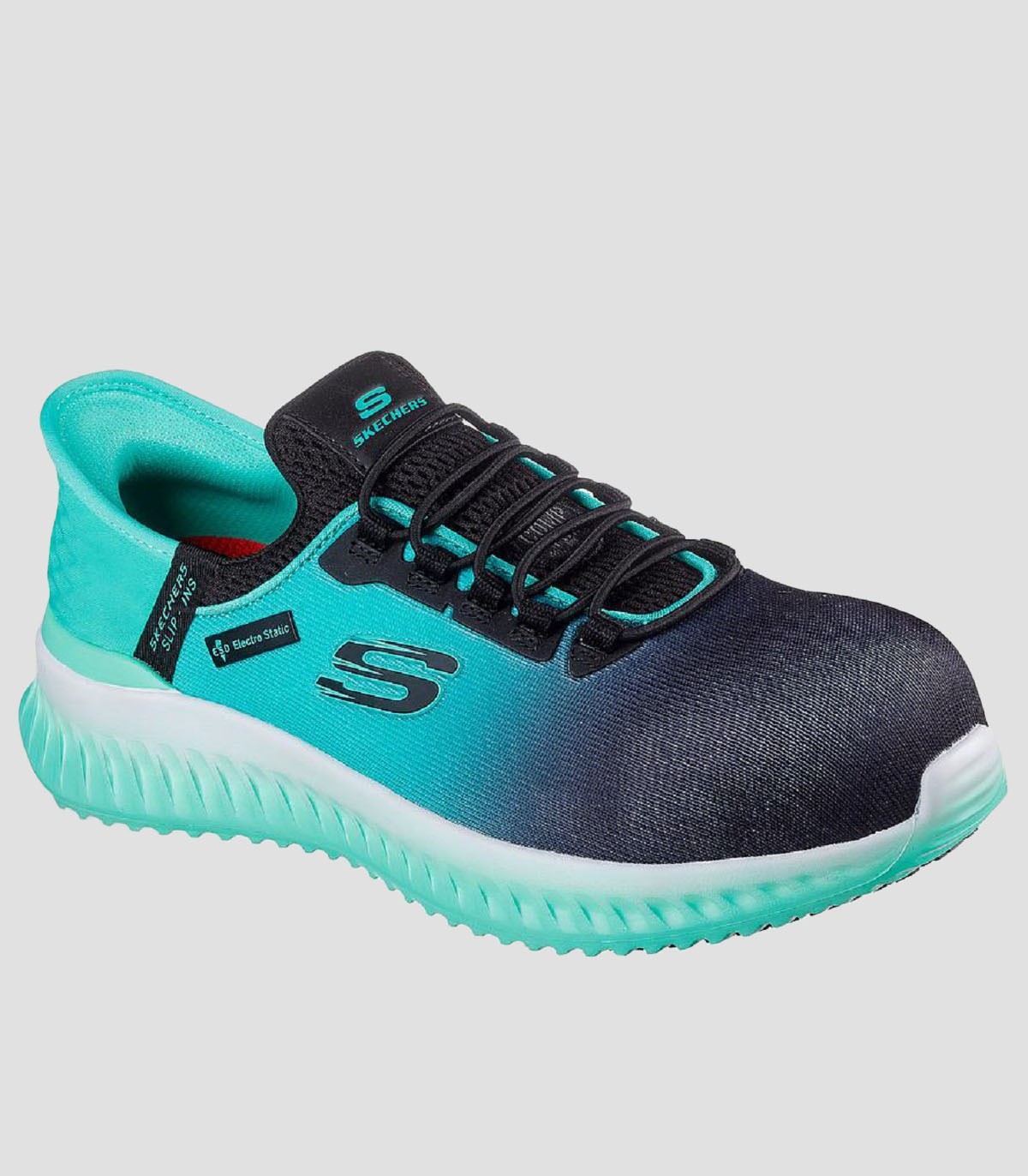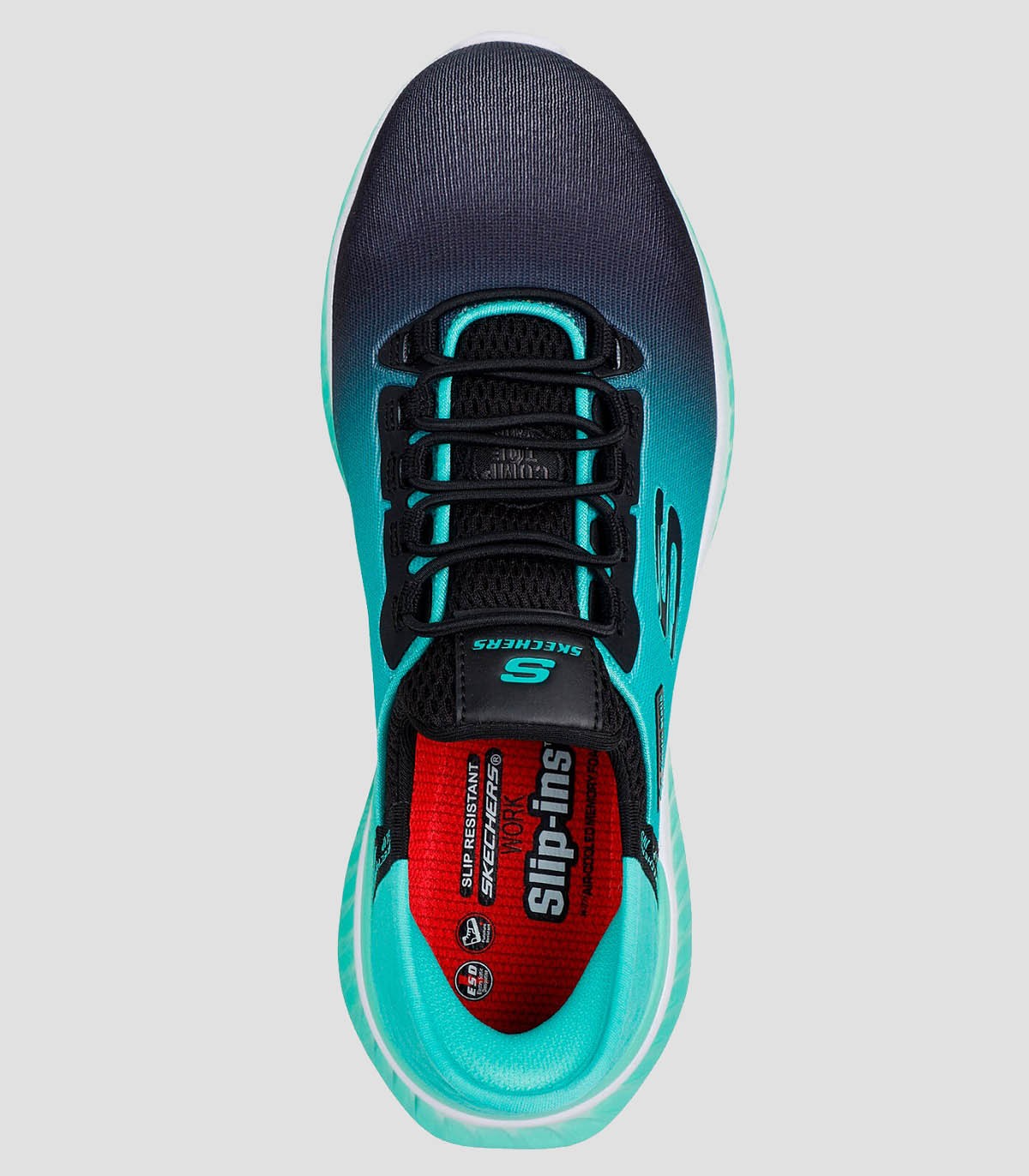 • Calzado Slip-on de trabajo cuenta con malla y parte superior sintética con un cordón elástico, panel de talón moldeado Skechers Slip-Ins® y plantilla acolchada Skechers Air-Cooled Memory Foam®.
